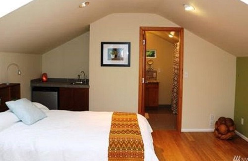 Accommodations: Cabin and Loft Apartment: Total of 3 Bedrooms and 2 Baths. The main cabin has two bedrooms (one set up as a den with a queen sofa-bed) and one bath with a walk-in shower with dual rain shower-heads; fully stocked kitchen with microwave, dishwasher and coffee maker; open living/dining area with cathedral ceilings and full window wall view of the Canal and the Olympic Mountains. The separate loft apartment is a Master Suite with water view, wet bar with mini fridge and microwave, deck, seating area, and a bathroom with tub/shower and dual sinks. Start your morning with coffee in your own luxury area. There is a large shaded entertainment deck on the beach side of the cabin, that hangs over the water at high tides. Hear the tides roll in and lap against the shore (or in winter, the water CRASHES against the bulkhead!) Experience amazing sunsets. In the winter, the cabin provides a cozy retreat to watch storms while enjoying a blazing fire in the large stone fireplace. There is also an electric fireplace in the loft apartment.