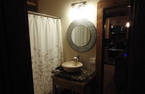 Cabin: The 1st floor offers a spacious living area with huge stone fireplace, open kitchen to enjoy the view, along with a bedroom with queen bed with full bath. The 1st floor also boast a covered front porch with seating for 10 and an outside dining table for 6. The second floor also offers a huge living area along with the master bedroom with private balcony and master bath with huge Jacuzzi tub and open stone shower. The 2nd floor also has a full length balcony facing the lake from the living area. The 3rd floor loft offers two full beds, one on each end. Large flat screen TVs are located in both living areas and all bedrooms including a TV for each of the beds in the upstairs loft ( 6 total throughout) with DISH TV. Like music? Build a fire in the outdoor fire pit and sit back and relax! Seems most folks just can’t seem to leave the front porch due to the view!