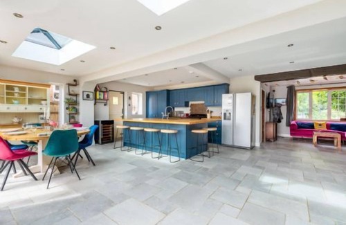 The cottage’s inviting open-plan living area is the heart of the home, seamlessly connecting the kitchen, dining, and lounge spaces, perfect for socialising and relaxing. A snug with a flat-screen TV and a wood burner in the fireplace offers a cosy retreat after a day exploring Norfolk.