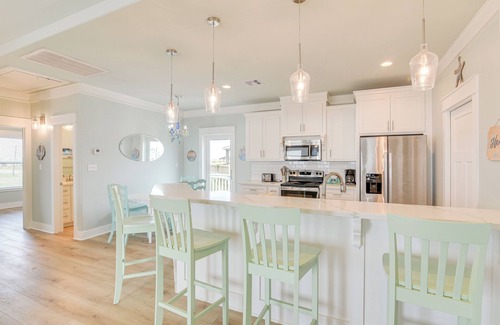 Indulge in the essence of seaside serenity at this stunning vacation rental in Gilchrist. Highlighted by its sweeping ocean views, 'Shores-Uh-Bliss' offers your family a bright and airy interior with 3 bedrooms, 2 bathrooms, and a full kitchen. This home also features a hot tub and a spacious deck where you can serve a tasty BBQ! After lounging on the beach or taking a day trip to Galveston, enjoy the beautiful sunset over the bay.