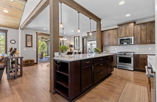 Escape to the beauty of Blanchard, Idaho with a stay at our luxury vacation rental nestled in the Stoneridge area. Just minutes from a tee time at Stoneridge Resort Golf Course! Perfectly situated in this picturesque region, our cozy home offers the ideal blend of comfort and convenience for your getaway. Blanchard Bliss features 4 bedrooms, 3 bathrooms, a hot tub, and a living area on each floor, providing ample space for relaxation and entertainment. The open layout kitchen includes a large island for cooking all of your favorite meals! Many appliances and kitchen essentials, perfect for culinary enthusiasts. The living room boasts vaulted ceilings and a stone-to-ceiling gas fireplace, creating a warm and inviting atmosphere. Enter the primary bedroom to a private retreat with a luxurious master bathroom, offering comfort and privacy. Work or unwind in the open living area, then step outside to an open patio perfect for a BBQ night! This cozy home also includes a laundry room, central air conditioning, and driveway space for your convenience.