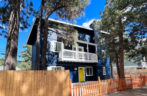 3 story quaint blue cottage in Big Bear Lake. The cottage has one queen sleeper sofa in the living room, an open loft with a queen and twin, and a bedroom with a queen. It also has an attic with 3 additional twins. The property has all the essentials plus a lovely outdoor hot tub. The home is off a main street of Big Bear Blvd making it easily accessible for those not wanting to drive deep into the mountain. One full bathroom is also on the first floor. The living room has a cozy fireplace and games so your group can enjoy and have fun!