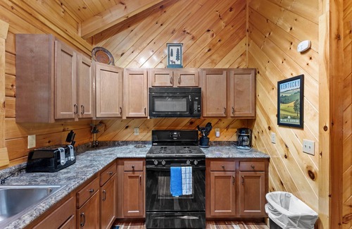 Cooking at the cabin is easy and convenient in the fully equipped kitchen featuring a coffee maker, microwave, stove, pots, and pans, and utensils. Just bring food, drinks, and charcoal if you want to fire up the grill!