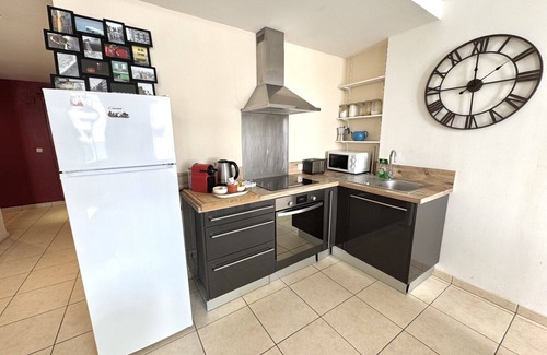 The American kitchen, modern and fully equipped, is perfect for preparing your meals with ease. It includes an induction hob, an oven, a microwave, a fridge with freezer, a coffee maker, a kettle, a toaster as well as all the crockery and utensils needed. A friendly dining table allows you to share pleasant meals on site or to plan your day around a good breakfast.