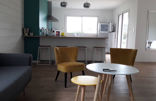 The RED HOUSE, classified furnished tourism 4 *, is built in 2017. The house has a perfect location in second line seafront of the small seaside resort of Denneville-Plage on the west coast of Cotentin (10km from Barneville-Carteret) just across the island of Jersey, 50m from the sea. one of the most beautiful beaches in Normandy from where you can walk to the harbor dominated by the old church of Portbail. You will be seduced by the proposed volumes and penetrating light, without forgetting the sea view from the balcony. We accept your pets. The house is 160m² and has 4 bedrooms for 12 people. It has 1 bathroom on the ground floor with sauna and 1 bathroom upstairs, 2 separate toilets, 1 game room. Its garden shed will allow you to store, bicycles and beach equipment. Large south facing terrace with garden furniture and sun loungers when the sun is there. Free wifi internet, TV with access to the German bouquet, bluetooth stereo and pellet stove to enjoy the house when the weather is not part .. It is located on a plot of 900m ² fully enclosed.