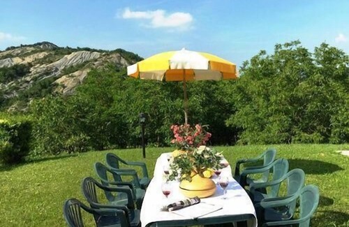 The farmhouse is surrounded on 4 sides by a private garden furnished with table, chairs and sun umbrella for complete privacy. Adjacent large green areas bordered by paths leading to the top of the hill where it is possible to see the Apennines on the border with Umbria.