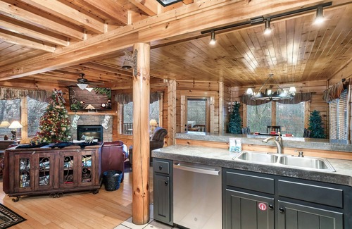 Our cabin will capture your imagination with its sophisticated log décor. Enjoy the Stadium-Style THEATER, Views, Pool Table, Arcade and stocked kitchen. Our 3 level cabin is perfectly suited for groups. Upstairs king bedroom has a private bath, jacuzzi and 2-person shower. Downstairs is the queen bedroom w/ its own fireplace and a bedroom w/ a queen bed and a twin / full bunk bed.