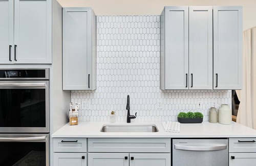 + fully stocked kitchen with stainless steel appliances and gas range
