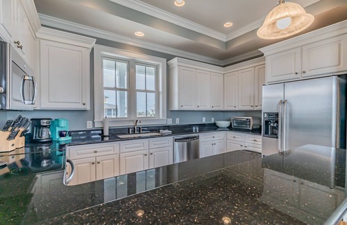 The home's main level boasts a stylish kitchen with granite countertops, stainless steel appliances, and a breakfast bar that seats three. Guests can enjoy their meals at the dining table adjacent to the kitchen which seats six.