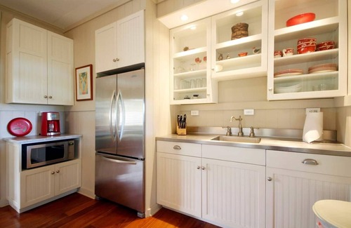 Cottage: The restored 2 bedroom, 2 bathroom guest cottage features vintage Hawaiian decor, a living room, a dining room, a kitchen and a large lanai that looks out over a large, manicured lawn. Enjoy ocean views from the master bedroom as well as the lanai.
