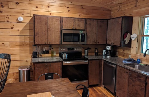 As you approach the cabin from below, following an old logging road through the woods, you'll be greeted by an excellent seating space on the front deck. This is a great spot to get acquainted with the property before entering the cabin, where you'll find a charming open-concept living room, a well-appointed kitchen, and a cozy dining area.