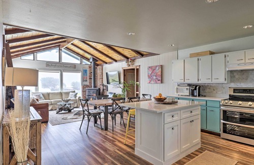 INDOOR LIVING: Smart TV w/ Netflix & Amazon Prime, wood-burning stove, vaulted ceilings, sliding glass doors, dining table, local art decor, ceiling fans, board games