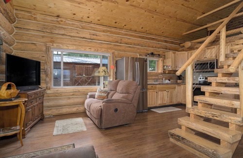 This handcrafted log cabin features vaulted ceilings, rustic wood finishes, and an open living area with a fully stocked kitchen and cozy lounge space. The main bedroom offers a restful night’s sleep, while the loft is perfect for kids or extra guests.