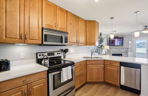 This waterfront property at Lighthouse Cove is a perfect retreat for any season. With its real flame fireplace and jetted bathtub, it provides everything needed for the ultimate in a relaxing getaway. This condo is located adjacent to the beach and near to the indoor pool. The condo has indoor and outdoor (seasonal) pools and hot tubs for year-round enjoyment. In the summer you are just steps away from the private beach and you can fish from the docks. Noah`s Ark waterpark is a short walk so you can avoid paying for parking there and comfortably return to your own condo for lunch mid-day.