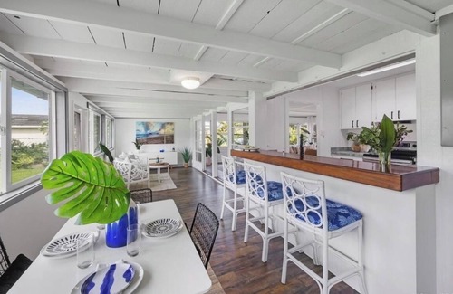 Discover Kailua's island charm while staying in our Hawaiian style home. Wake up to chirping birds on a quiet treelined street. Enjoy your breakfast in the sun room overlooking the lush green backyard filled with fruit trees. The living spaces are open & flooded w/ natural light & surrounded by local greenery. The house takes advantage of trade winds coming off Kailua beach shores. Located .5 mile from Kailua Town and .5 mile from one of the worlds best beaches (Kailua / Lanikai beach).