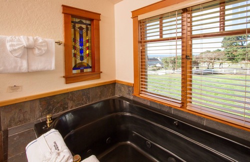 King suite with ocean and village views ● Two-person Jacuzzi tub ● Two person shower, dual sinks ● Queen sleeper ● Fully equipped kitchen ● Gas replace ● Radiant heat floors ● Craftsman-style furnishings ● South-facing balcony ● 9-hole golf course 2 miles away ● Close to shopping and world-class restaurants ● Biking trails nearby ● Hiking in the Mendocino Headlands State Park nearby