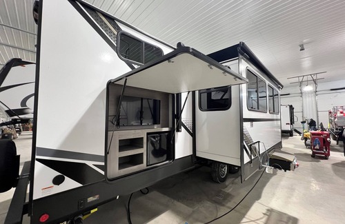 Your home away from home in Crawfordsville with 2 bedrooms. This brilliant recreational vehicle offers a cozy queen bed and a fun bunk bed for a good night's sleep. With 2 bathrooms equipped with a hair dryer and shower, you'll feel refreshed and ready for your adventures. The living room provides an enchanting space with a comfy full bed for extra guests. Full amenities available for your stay including WiFi. A great place to call homebase while you're away, we hope you enjoy your stay. Please Note: While we don’t allow pets, since this is our personal camper pets do stay in it. We thoroughly clean after every use (including our own), but pet hair may still exists.