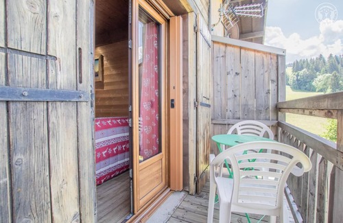 Gîte located on the first floor. Kitchen. Living room. Shower room with WC. 1 bedroom closed by a curtain (1 double bed 140x190 cm). Mezzanine bedroom (2 single beds 90x190 cm). Balcony. Shared washing machine and dryer. Common ground. Hot tub in summer. Contemporary style chalet located at the entrance of the village, opposite the ski slopes. Comfortable cottage. Pleasant mountain character. Nice volume in the stay. Common outdoor space furnished. Beautiful very clear view on the massif. Proximity to slopes + shops & services.