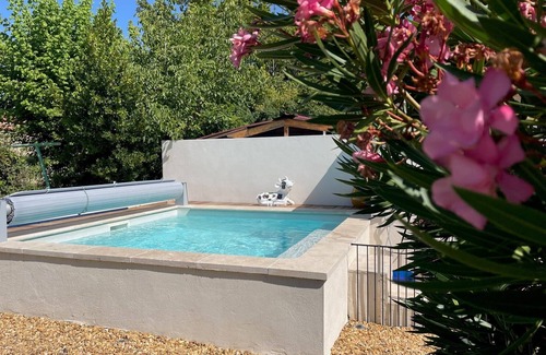 La Caelifera, a beautifully renovated private villa in L'Isle-Sur-la-Sorgue, 5 minute walk from the pedestrian city center, features a modern Provencal Garden entrance and a delightful south-facing veranda overlooking a garden and a pool by the Nevon canal (open from April, heated upon request, under special conditions)