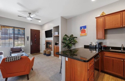 Welcome to your luxurious La Quinta retreat, where convenience meets comfort in a stylish package. Boasting a Central location, our ground floor condo encourages an engaging retreat without compromising tranquillity. Enter a spacious and elegant living room accentuated by a warming gas fireplace. Unwind on the comfortable pull-out sofa while streaming your favorite shows on TV. The adjoining full-size kitchen, complete with modern appliances, cooking basics, and a coffee maker, inspires home-cooked meals. The condo’s plush bedroom invites a good night's sleep before another day of adventure. It features a walk-in closet, providing ample space for your belongings. The full bathroom with a bathtub/shower, hairdryer, and essentials promises a hassle-free morning routine. Enjoy the sunset from your private terrace overlooking the shimmering swimming Pool and inviting hot tub. It's a perfect spot for that morning cup or a peaceful evening glass of wine, with outdoor furniture available for ultimate comfort. The condo provides efficient heating and air conditioning systems, a dedicated workspace for digital nomads, and a stack washer-dryer ensuring fresh clothes anytime. It comes equipped with important safety measures such as smoke and carbon monoxide alarms, a fire extinguisher, and a first aid kit.
