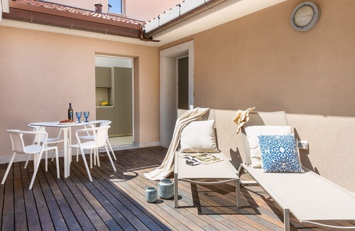 The apartment features an independent fully equipped kitchen, a spacious living room, and two balconies. The smaller balcony offers a charming view of the lively harbor, perfect for enjoying a morning coffee or an evening drink. The larger balcony overlooks a quiet inner garden and is furnished with comfortable loungers, providing an ideal spot to relax and sunbathe.