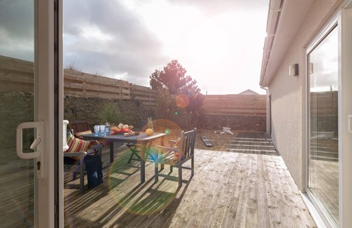 Lagwn Glas boasts a large, private, decked patio that serves as a perfect suntrap during the day. This outdoor space is ideal for enjoying a sunny morning coffee, a cold lunchtime beer, or an afternoon Pimms. The property also provides off-road parking for three cars, making it easy for guests to arrive and settle in.