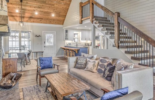 The open plan main level features a kitchen with a breakfast bar, dining table for 8, and a comfortable sitting area around the stone wood fireplace. The owner is a chef and thus is outfitted with all the necessary items to cook for your group. Granite countertops, farmhouse sink, a glass top cooktop, electric oven, new fridge with icemaker, a crockpot, Keurig, panini press, waffle maker, hand mixer, toaster oven, sous vide, and all the bakeware you would ever need. Outside you will find a Webber Genesis grill, perfect for grilling all year round.