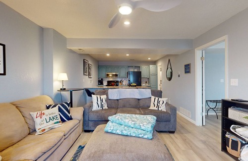 The well-equipped kitchen with ample counter space is perfect for preparing delicious meals, while the breakfast bar seating provides a casual dining option. The lake view living room boasts plush seating and a large smart TV, ideal for cozy nights in. Flip the ottoman cover over for creative additional snack space or a place to put down your drinks. The primary bedroom also overlooks the wonderful views and includes an attached ensuite bathroom, as well as a dedicated desk for remote work or planning your daily adventures.