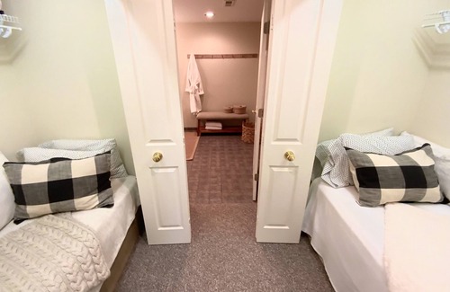 The lower level has a second family room, a family suite and a primary bedroom. The family suite has two full beds, two extra twin sleeping nooks for kids/teens and a large bathroom. The primary bedroom has a king bed, a newly renovated bath with a zero entry shower floor and a desk. There is a twin bed within the large walk in closet that is great for extra sleeping. The lower level second family room has a double door slider that leads to a fully furnished sunroom providing a quiet retreat for reading and morning coffee. The sunroom opens onto the gentle sloping path to the lake.