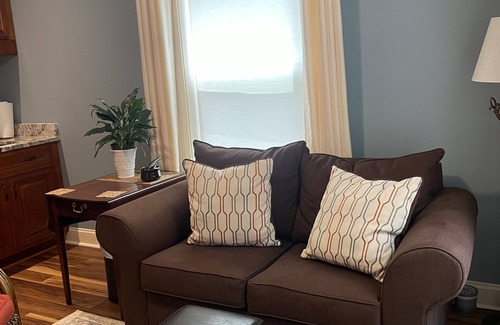 This brightly lit, nicely appointed, and well equipped "tiny home" apartment has all you need for a getaway, including a kitchenette (sink, fridge, microwave, induction hot plate, toaster oven, Keurig, drip coffee maker, crockery, and utensils), one bathroom with shower. It is in the lower level of our home in a peaceful neighborhood. Coffee pods, ground coffee, sugar, stevia, creamer and light snacks are provided.