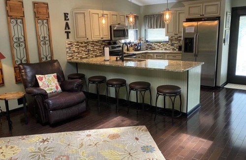Our house at the lake features hardwood floors throughout the downstairs living areas, beautiful, functional kitchen with granite counters and stainless appliances. The kitchen is fully stocked and even has a keurig and a crock pot!