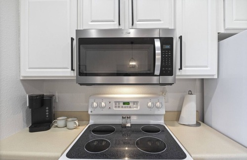 This open concept kitchen has all the essentials to prepare meals and a K-cup coffee maker. There is a breakfast bar with four barstools and a dining table with seating for 6.