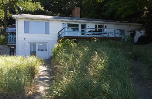 Relax in this sweet cottage on the Lake Michigan shore in a quiet family neighborhood. A wooden deck is directly over the beach to catch the cool lake breeze as you sun bathe (complete with lounge chairs), and the private shore is feet away, no stairs needed. A second deck with a bit of shade is next to the kitchen. It has a picnic table and patio table. There is a large propane gas grill on the patio next to the deck.