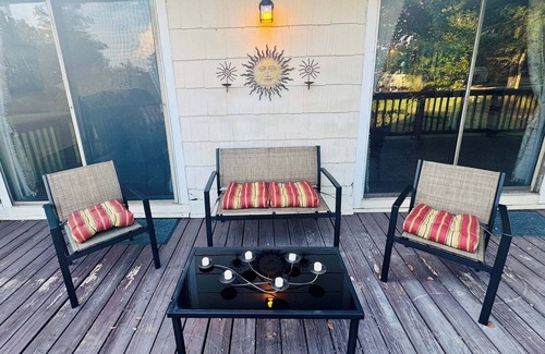 Two comfy bedrooms, each with a full bed, ceiling fan, individual AC unit, and black-out curtains could be your best sleep ever. The bath features a walk-in shower, bidet, hair dryer, and wall fan, and is supplied with soap, shampoo, conditioner, towels, and toilet paper for your convenience. The living room, dining room, and kitchen are all connected with an open floor plan and two sliding glass doors, so the lake is always in view. Plenty of comfortable seating in the living room for watching TV, including an oversized recliner for an afternoon nap or for a good book from our bookshelf. There's also a DVD player and a collection of classic movies. The dining table seats six with plenty of room for a big meal or for a game or jigsaw puzzle from our collection. The kitchen is fully equipped with plates, cups, glassware, silverware, cookware, tea kettle, coffee maker, Keurig, French press, electric griddle, smoothie blender, and crock pot. The cottage has a large deck for enjoying the view, with seating, a coffee table, and an electric fan. There's also covered parking in the cottage's pole barn. The cottage is just a mile from the boat ramp, coin laundry, and bait and convenience store at Ingram's Marina.