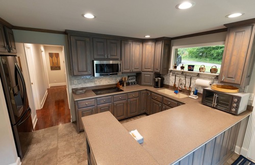 -The home is equipped with a spacious kitchen equipped with a coffee maker, dishwasher, large fridge, countertop eye burner, over the range microwave, & a large kitchen table! Please note this property does not have a traditional oven. There is a countertop convection oven on the countertop for your baking needs. The home also includes black stone flat top with propane on site that we provide, WIFI, & smart tv's throughout the entire house. Please note cable is not provided.