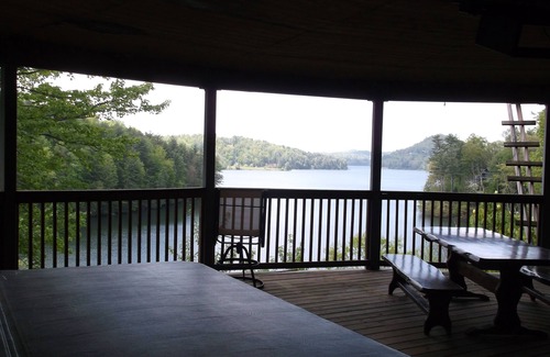 Everyone says it's the Best View of Lake Glenville. A secluded getaway where the calming sounds of a nearby creek falls down the mountainside. This unique, end of the road cottage feels like your hanging in the trees. This split 2BR/3BA cottage has a master suite with private bath and private TV. The 2nd BR has 2 twin beds that can be connected OR separated depending upon the situation and 2nd bath is directly outside BR. Open floor plan allows full views of Lake Glenville from both the living area upstairs as well as the open lower deck area that has a 4 person hot tub, weight machine and large solid wood picnic table as well as 3rd bathroom and storage room and laundry room. Access the lower area either from the outside stairs or the inside spiral stairs, where you will also find the laundry room.