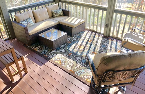 Guests on the lower level can enjoy their own porch where you can enjoy the lake view and mountain surroundings on the wooden porch swing. This level has the stairs that lead you to the very sought-after gentle sloping backyard that is less steep than the majority of the lakefront homes in the area (but still a moderate walk, so feel free to ask us any questions you may have.)