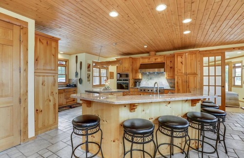 One of the spectacular features of the Lodge is the river rock fireplace in the main level living room. Another is the cedar tongue and grove cathedral ceilings that complement the living area. Tumbled Italian tile, marble, hardwoods and carpet is incorporated throughout the well-appointed rooms. There is a massive gourmet kitchen with a Viking Professional 6 burner gas range as well as an over sized Sub Zero refrigerator.
