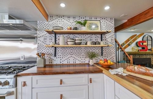 A chef’s kitchen is well stocked with an everything you need to prepare a quick meal or a gourmet feast. Pots, pans, mixing bowls, utensils, dishes, silverware, storage containers, as well as Kitchen Aid stand mixer, coffee maker, coffee grinder, electric kettle, toaster & microwave. The gas stove has 8 burners, a removable griddle, and two ovens, one full size and one smaller. Salt and pepper, basic spices, sugar and flour are also on hand.