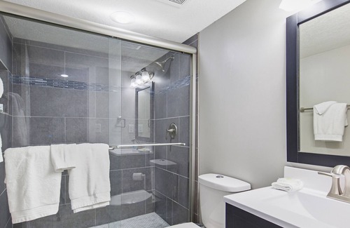 Sleek and stylish throughout, this two-story vacation rental boasts a well-equipped, contemporary kitchen with stainless steel appliances, a dining table for sit-down meals or family game nights, and a living area with matching sofas and a TV ready to stream all your favorite channels.