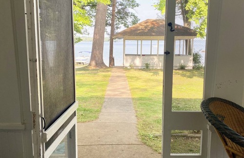 This recently-restored vintage lakehouse is located on the high bluffs of Lake Margrethe in Grayling, Michigan. The house and lakefront offers a relaxing and comfortable setting directly on beautiful Lake Margrethe. The property affords many areas for gathering and entertaining, including a large screened-in porch, back patio with gas grill, grass lawn with great lake views, a pavilion overlooking the water, a long dock and two kayaks, a large great room, and a full dining room.