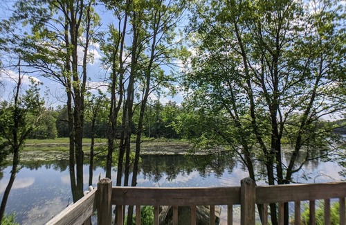 Enough room for the extended family. Main floor has kitchen, full bathroom and bedroom with King bed. The living room looks right out at the peaceful Lake Wicwas and leads to a large deck with ample seating and gas grill. Upstairs are two bedrooms, one with two Twin trundle beds and the other with a Queen bed that has the lake view at your feet. In the lower level is a pool table, a foosball table, another bathroom, your washer and dryer and a futon for 2. This is a rare find and is perfect for the family who likes to be surrounded by nature at it's finest. Come and stay! Bring your kayaks or rent them from a local spot. This property will leave your rested and restored.
