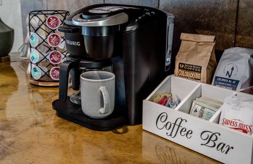 Unleash your culinary creativity in our fully equipped kitchen, featuring high-end amenities, utensils, and a versatile coffee station with options for drip, K-cups, or French press. Enjoy the convenience of a coffee grinder and an under-counter ice maker, making every meal a delight.