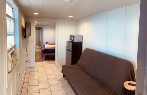 2 bedrooms with futons. Primary room is set up as a small living area but can convert to a bedroom. Mini fridge and microwave along with a smart TV in unit. Small outdoor patio area to enjoy the lake view.