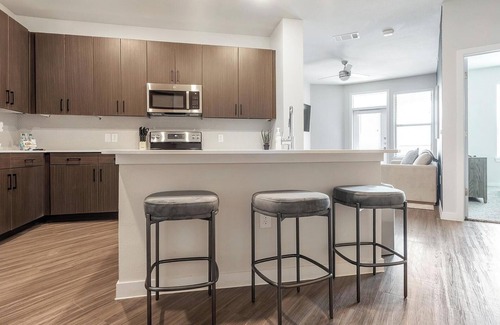 Indulge in luxury at Lyric at the Merc in San Antonio, TX. Our prime location on the Northwest side of the city places you near top dining, shopping, cultural hotspots, and scenic hill country escapes, offering the best of both urban living and natural beauty. Inside your fully-furnished apartment, you'll find everything you need for a seamless stay: a complete kitchen, generous closet space, and a laundry room with a washer and dryer.
