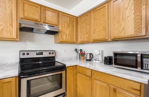 The townhouse features a well-designed floor plan with high ceilings and large windows that fill the space with natural light. The kitchen is fully equipped with modern appliances, including a refrigerator, stove, oven, microwave, and dishwasher, as well as all the cookware, dishes, and utensils you'll need to prepare meals. The living room features a comfortable sofa and flat-screen TV, while each of the three bedrooms includes a TV for your entertainment. The bedrooms offer a variety of sleeping options, including a king-size bed in the master bedroom and two comfortable queen-size beds in the other two bedrooms. Each bedroom also offers plenty of storage space. A half bathroom is located downstairs for added convenience.