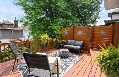 With 3 floors of outdoor entertaining, a grill and a massive fire pit for evening fun, this house has everything you need to host a weekend with family or friends. Start with a drink at the home's bourbon bar and proceed to the open concept kitchen and large dining space for inside gatherings. Or, walk to nearby patisserie for pastries, grab a pizza at the end of the street or hit the coffee shop around the corner, countless cocktail recos or microbreweries all without a need for a car. Want a gourmet coffee while still in your pajamas? Enjoy the espresso and nugget ice machine provided for hot or cold brews in comfort with all of your essential coffee bar ingredients included to make your travel easier. Host is a city tourism ambassador and happy to provide suggestions for your itinerary or reservation needs. House can be stocked with groceries or other purchases in advance with nominal service fee.