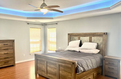 This spacious vacation home has 4 bedrooms 4 full bathrooms, 5 TVs, 2 large seating areas with big screen Tvs, a huge kitchen with a dishwasher and a microwave.