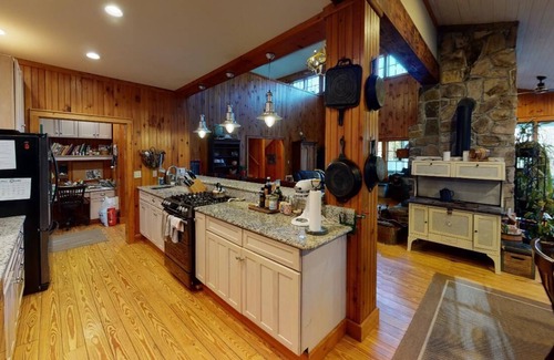 This home has 6 bedrooms/4 baths, 3 levels, a very nice apartment above the garage, large renovated kitchen with granite and black stainless appliances, large true mason wood burning fireplace, 1000’s of square feet of outdoor decks and living spaces, outdoor bar area, fire pit, and a two car garage.