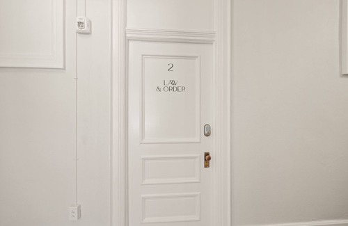 Law & Order at The McKey is one of our suites, which includes a king bed, seating area with kitchenette, and a bathroom.